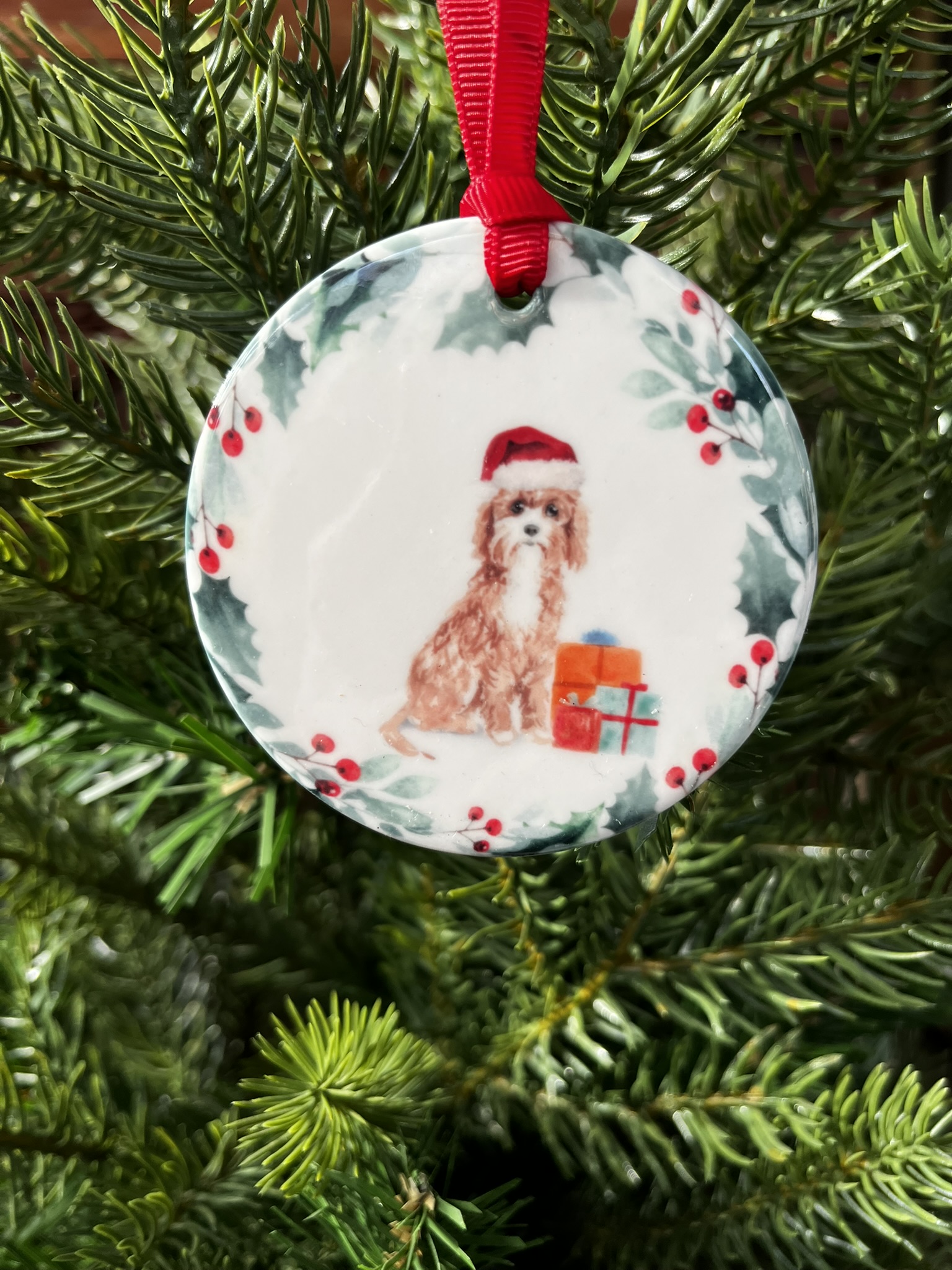 Add a touch of festive charm and seasonal warmth to your holiday décor with this beautiful ceramic hanging decoration. Featuring a delicately detailed watercolour illustration of a Cavapoo wearing a cheerful Christmas hat, this ornament perfectly captures the intelligence and character of this much-loved breed. Crafted from high-quality ceramic and finished to a high standard, it offers both lasting durability and elegant appeal. Ideal for decorating a Christmas tree, wreath, mantel, or festive display. It makes a thoughtful gift for dog lovers or a charming keepsake to enjoy year after year, bringing joy, personality, and festive spirit to any home.