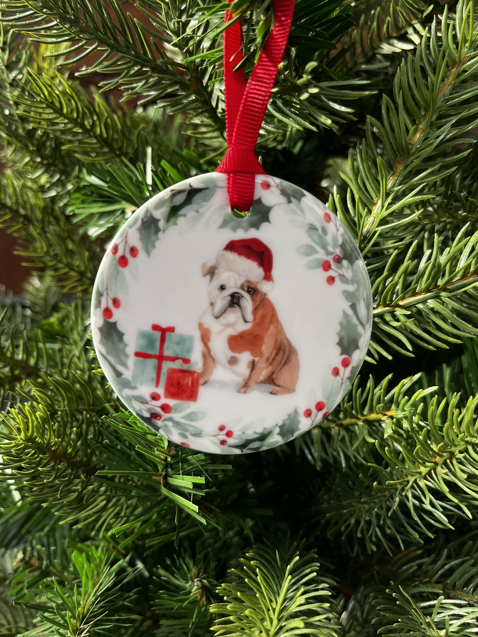 Add a touch of festive charm and character to your holiday décor with this beautiful ceramic hanging decoration. Featuring a finely detailed watercolour illustration of an English Bulldog wearing a cheerful Christmas hat, this ornament captures the lovable, sturdy, and affectionate nature of this iconic breed. Crafted from smooth, high-quality ceramic and finished to a refined standard, it is perfect for adorning a Christmas tree or displaying in a special place around the home. A thoughtful gift for dog lovers or a charming keepsake to treasure year after year, this decoration brings warmth, personality, and festive cheer to any home.