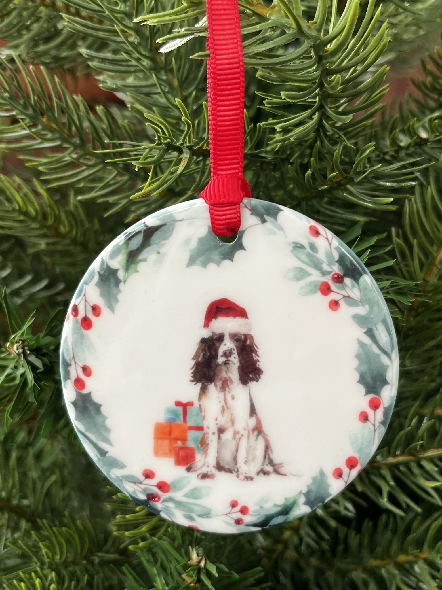 Add a touch of festive charm and seasonal warmth to your holiday décor with this beautiful ceramic hanging decoration. Featuring a delicately detailed watercolour illustration of a Liver and White Springer Spaniel wearing a cheerful Christmas hat. This ornament perfectly captures the playful spirit and gentle charm of this much-loved breed. Crafted from high-quality ceramic and finished to a high standard, it offers both lasting durability and elegant appeal. Ideal for decorating a Christmas tree, wreath, mantel, or festive display. This Liver and White Springer Spaniel hanging decoration makes a thoughtful gift for dog lovers or a charming keepsake to enjoy year after year.