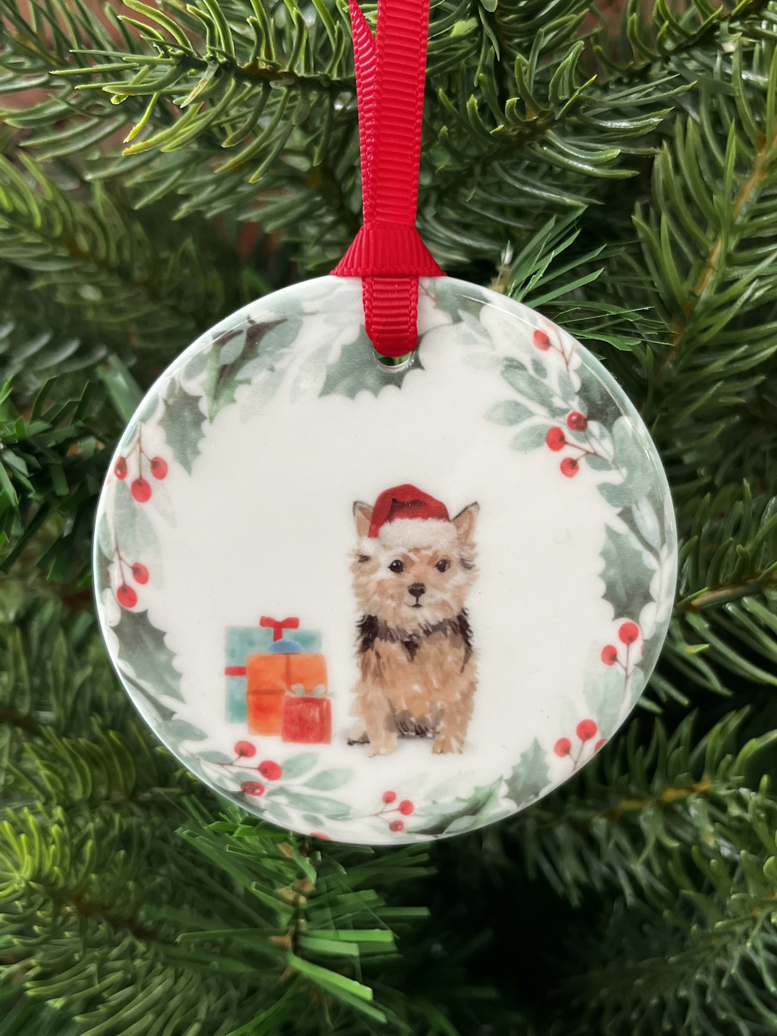 Add a touch of festive charm and seasonal warmth to your holiday décor with this beautiful ceramic hanging decoration. Featuring a delicately detailed watercolour illustration of a Norfolk Terrier wearing a cheerful Christmas hat, this elegant ornament captures the lively, confident, and affectionate character of this much-loved breed. Crafted from smooth, high-quality ceramic and finished to a refined standard, it makes a delightful addition to any Christmas tree, wreath, mantel, or festive display. Ideal as a thoughtful gift for dog lovers or a charming keepsake to treasure year after year, this decoration brings joy, personality, and festive cheer to any home.