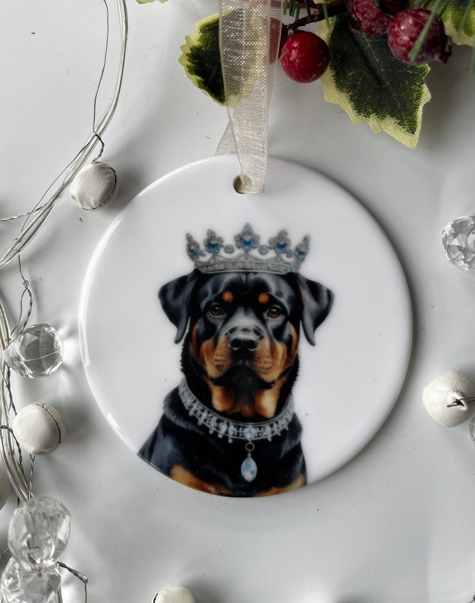 This striking ceramic hanging decoration features a beautifully detailed illustration of a Rottweiler wearing an elegant silver crown. Combining regal charm with the strength and loyalty of this much-admired breed. Crafted from high-quality ceramic and finished to a smooth, refined standard. This ornament is designed to be both eye-catching and enduring. Perfect for hanging in a special place around the home, on a decorative hook, or as part of a curated display, it adds character and personality to any space. Thoughtfully created to celebrate the intelligence, devotion, and noble presence of the Rottweiler. It makes a meaningful and thoughtful gift for Rottweiler lovers and dog enthusiasts alike. A timeless keepsake, this decoration is made to be cherished and enjoyed for many years to come.