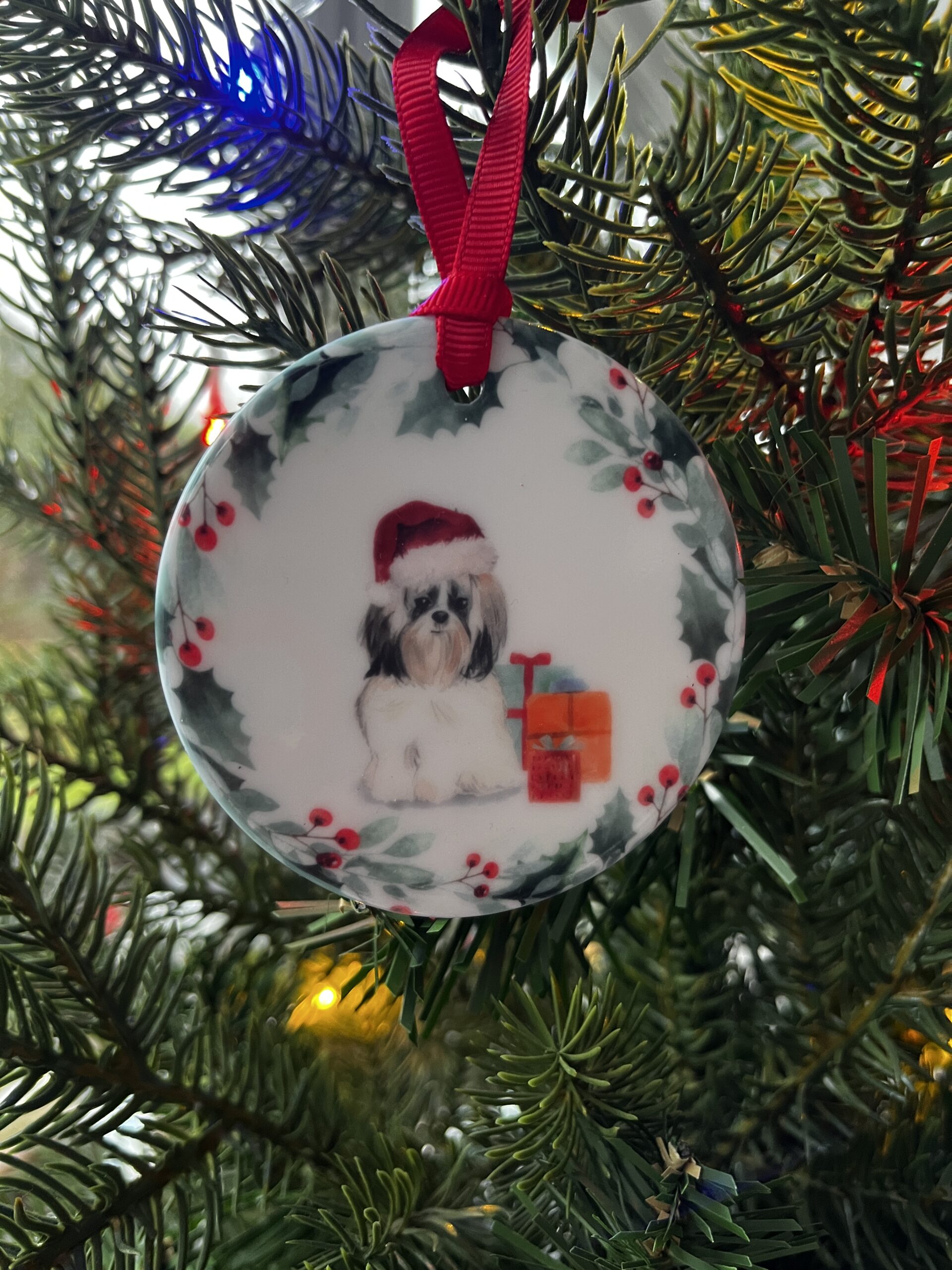 Add a touch of festive charm and seasonal warmth to your holiday décor with this exquisite ceramic hanging decoration. Featuring a beautifully detailed watercolour illustration of a Shih Tzu sitting down adorned with a cheerful Christmas hat. This elegant ornament perfectly captures the gentle, playful, and affectionate nature of this iconic breed. Expertly crafted from smooth, high-quality ceramic and finished to a refined standard, it offers both timeless appeal and lasting durability. Perfect for adorning a Christmas tree, wreath, mantel, or festive display. This Shih Tzu Sitting Hanging Decoration makes a thoughtful gift for dog lovers or a treasured keepsake to be admired year after year, bringing joy, character, and festive cheer to any home.