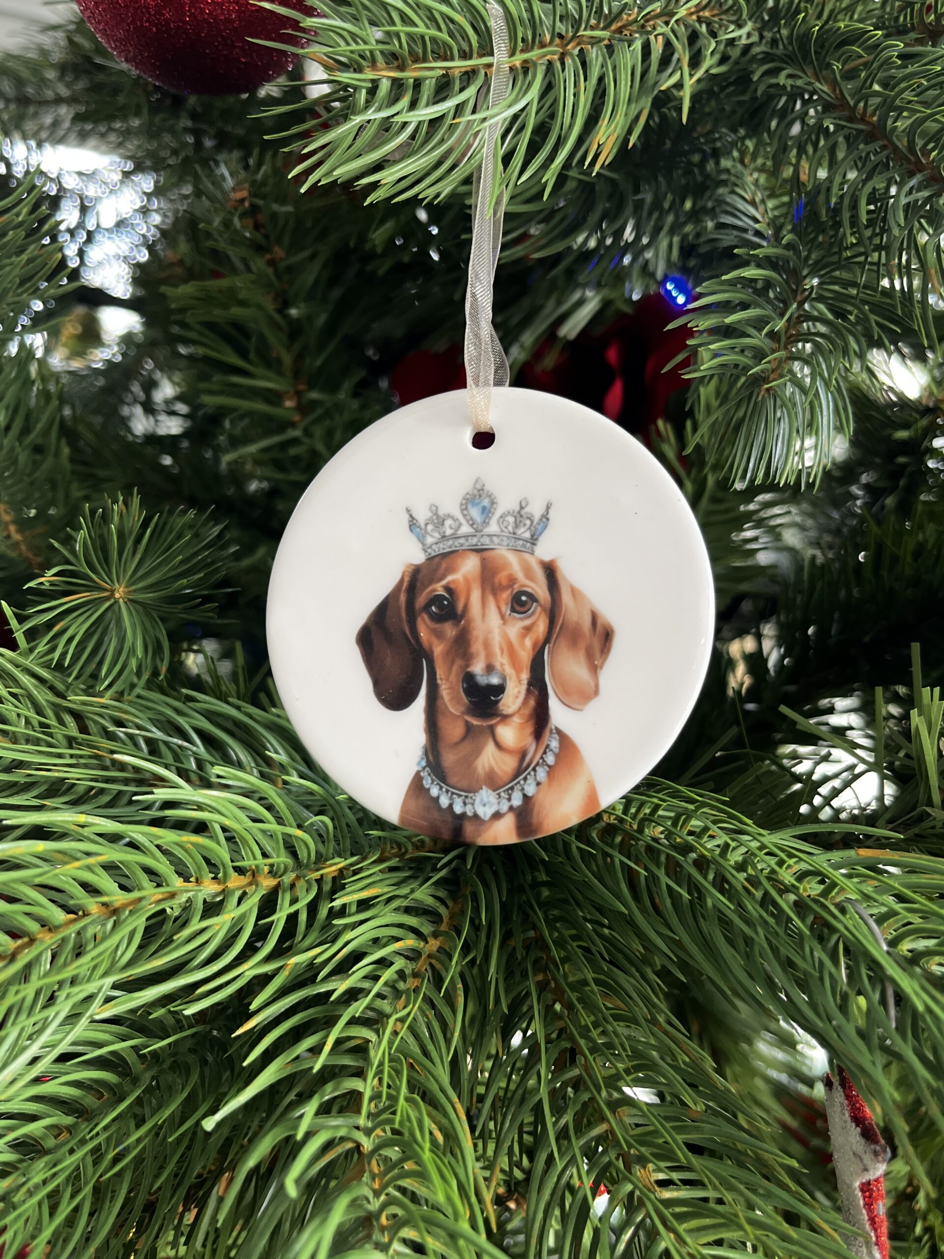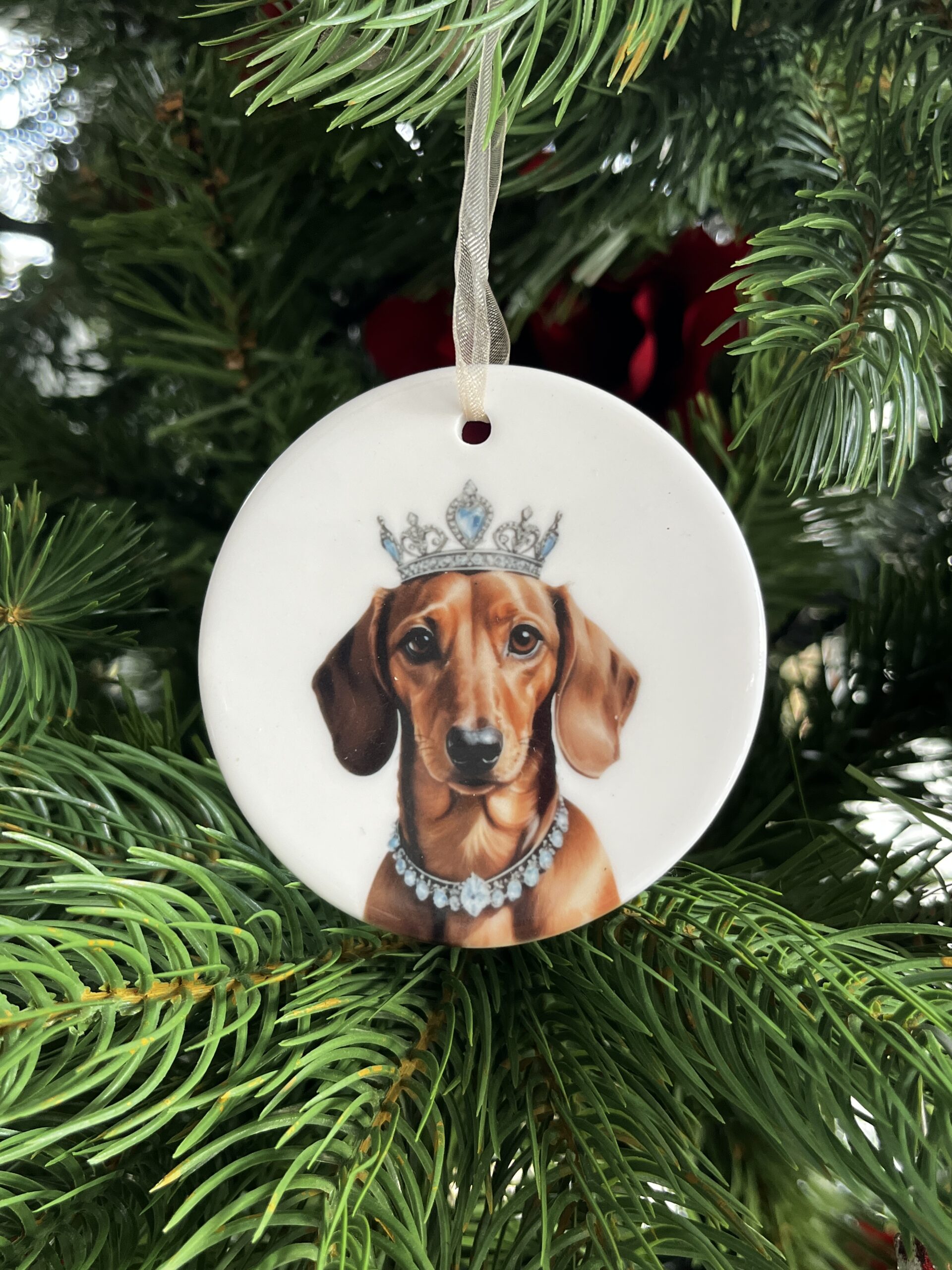 This beautifully crafted ceramic hanging decoration features a charming illustration of a tan Dachshund wearing a silver crown. Celebrating the distinctive personality and elegance of this much-loved breed. Carefully designed and finished to a high standard. This decorative piece combines playful character with a touch of sophistication, making it a standout addition to any home décor. Perfect for hanging in a special place, on a decorative hook, or as part of a display. It adds warmth and individuality to any setting. An ideal gift for Dachshund lovers, dog enthusiasts, or anyone who appreciates unique keepsakes. This ornament is designed to be treasured for many years, bringing joy, charm, and a hint of royal flair wherever it is displayed.