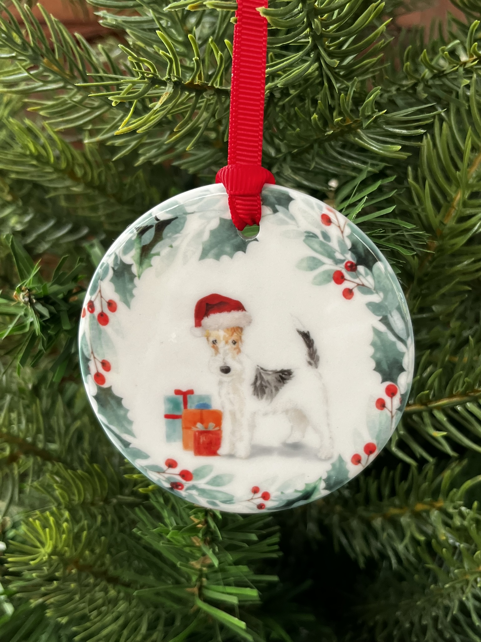 Add a touch of timeless festive charm and seasonal warmth to your holiday décor with this beautiful ceramic hanging decoration. Featuring a delicately detailed watercolour illustration of a Wire Haired Fox Terrier adorned with a cheerful Christmas hat, this elegant ornament celebrates the bold, confident, and affectionate character of this iconic breed. Crafted from smooth, high-quality ceramic and finished to a refined standard, it offers enduring quality and refined appeal. Perfect for adorning a Christmas tree, wreath, mantel, or festive display. This Wire Haired Fox Terrier hanging decoration makes a thoughtful gift for dog lovers or a treasured keepsake to enjoy year after year, bringing joy, character, and festive cheer to any home.
